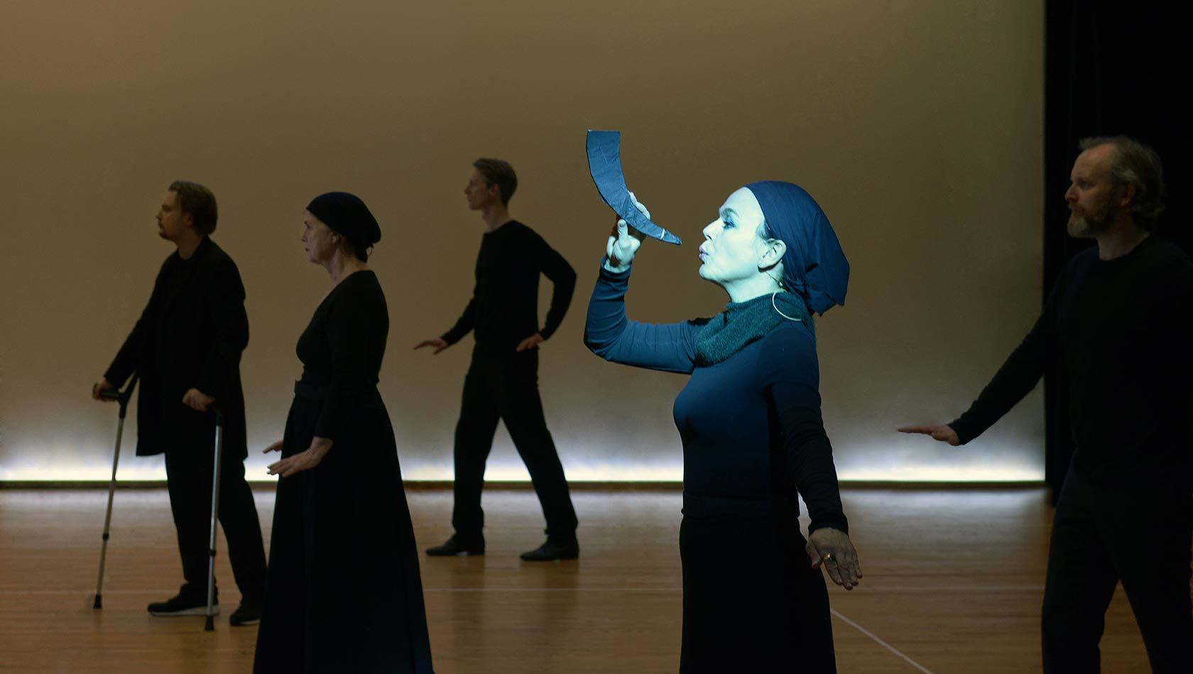 Og no skal vi spele Edda i Jon Fosses gjendikting. Vi har vore gjennom Stage A i april. Dette er første delen av arbeidet der Bob legg koreografi og prøver ut dei scenografiske løysingane. Bob som no er 75 år, og like lett i kroppen, har leika fram uendelege troll og gudar for oss. Vi har rutemønster på golvet igjen og videoopptak av rørslene våre i tid og rom. Eg er Volva, ei spådomskvinne. Eg veit mykje om rørslene mine og lite om teksten så langt. Men eg veit at det blir visuelt, leikent, musikalsk og poetisk. Det blir ei framsyning med mange overraskingar.