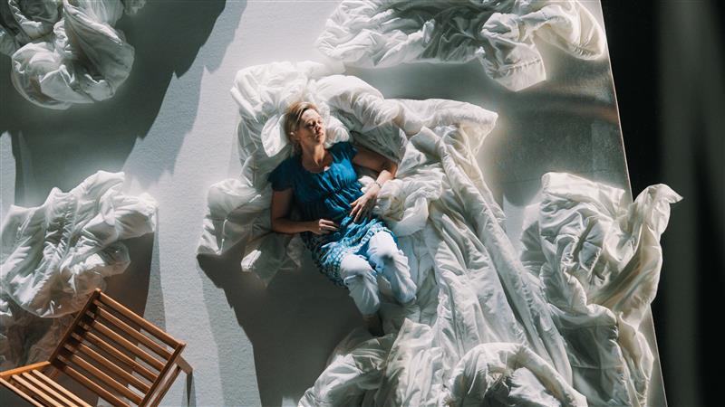 Scenografien i Kommunion er ved Erlend Birkeland, og består av mange dyner. Foto: Ole Herman Andersen.