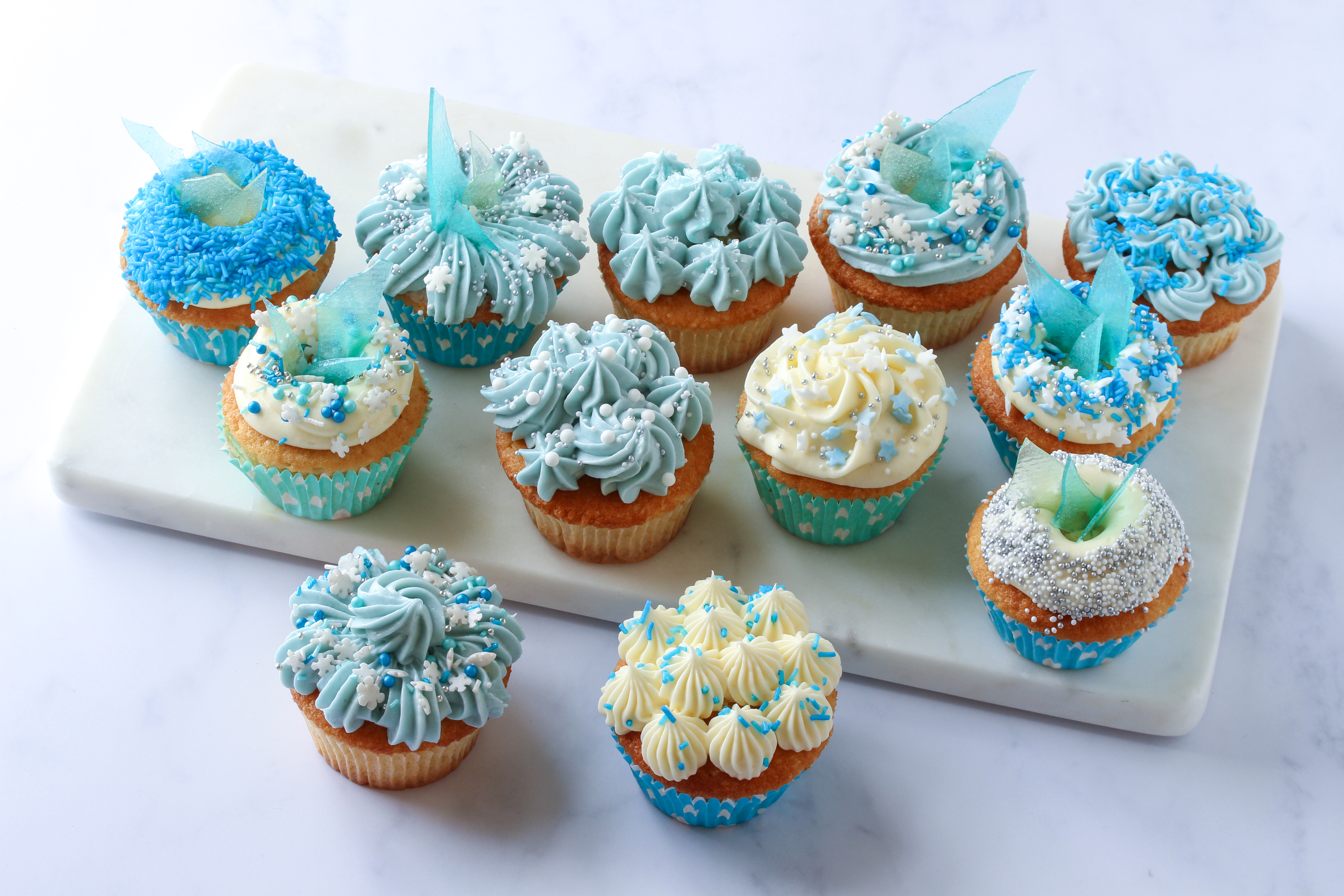 Blå slikkepinnar fann eg i pose hos Normal. Diverse blått og kvitt kakestrø finst i boksar frå Dr. Oetker (i daglegvare), hos Søstrene Grene og hos Normal.