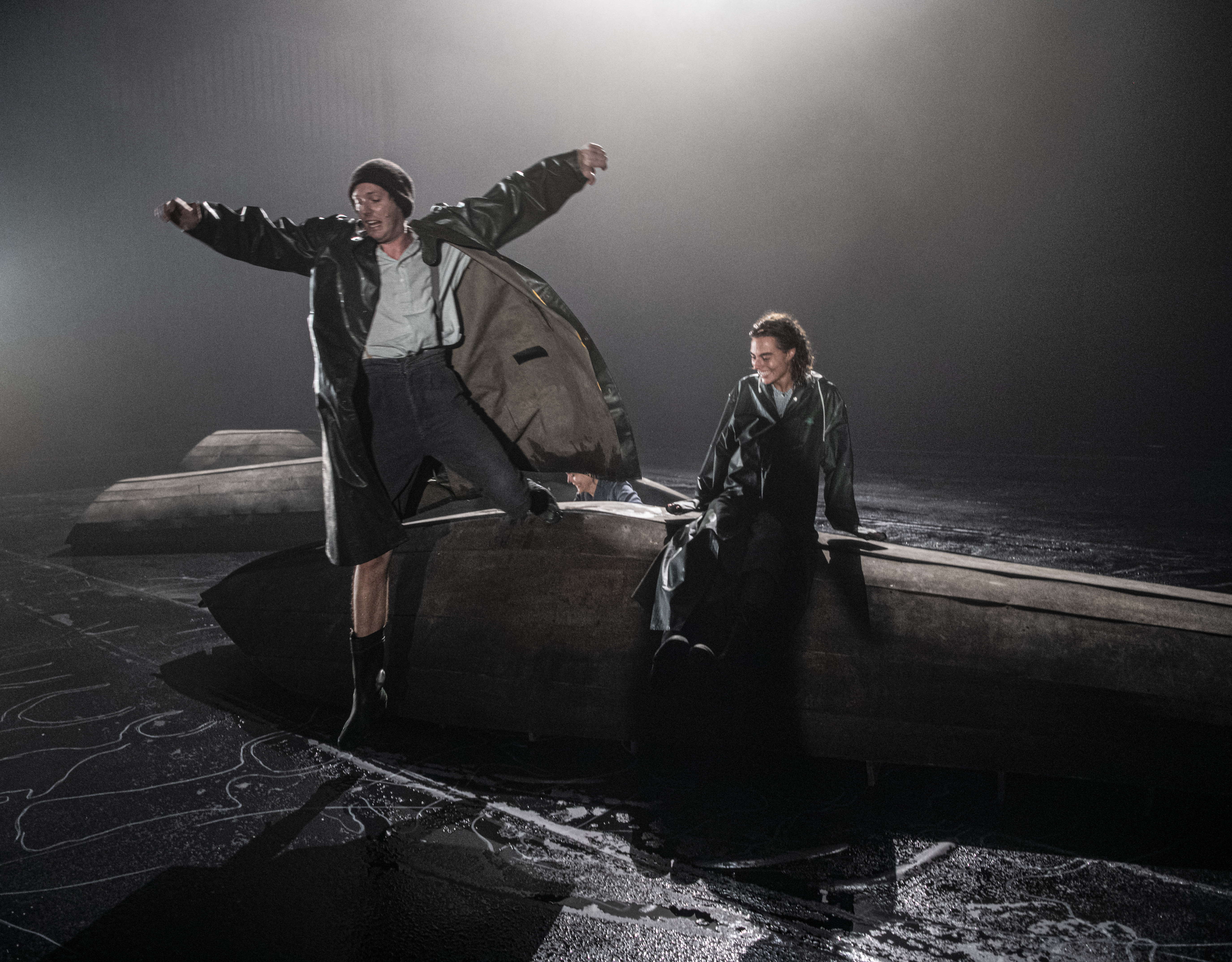 Regn, vatn, hav og båtar er sentralt i historia om Asle og Alida, spelt av Christian Ruud Kallum og Madelena S. Helly-Hansen. Foto: Erik Berg.