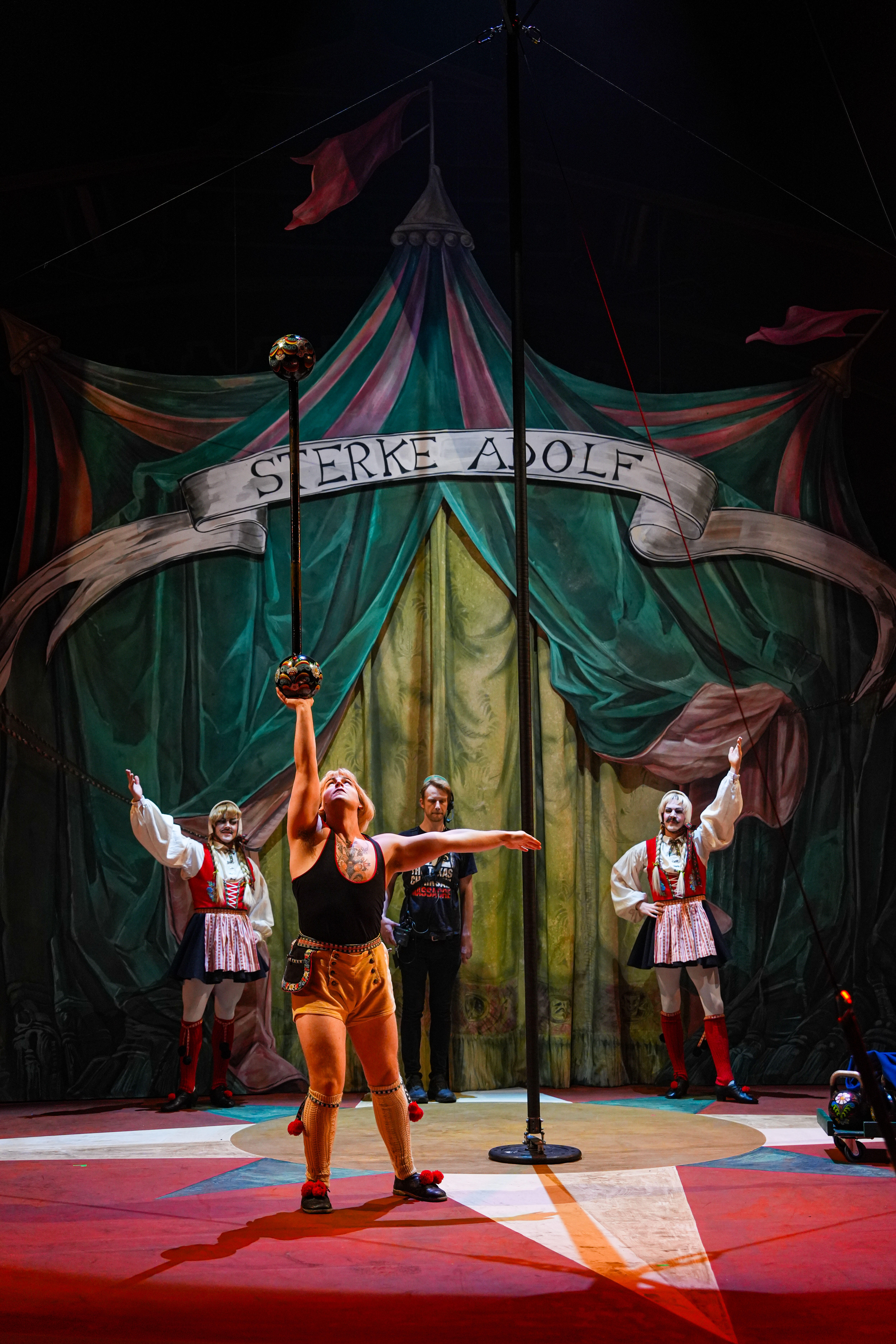 Sterke Adolf balanserer vektstonga på ei hand. Foto: Siren Høyland Sæter/Det Norske Teatret.
