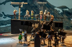 I Tolvskillingsoperaen 2021 er det ein havarert buss for tog på scenen. Skodespelarane er også dokke- og kameraførarar. Foto: Dag Jenssen.