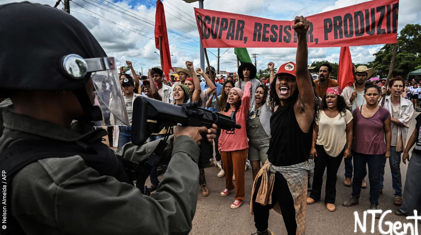 PÅ SKJERM Kay Sara, Gracinha Donato, Célia Maracajà, kor av militante demonstrantar frå Movimento dos Trabalhadores Rurais sem Terra (MST) og som Teiresias Ailton Krenak