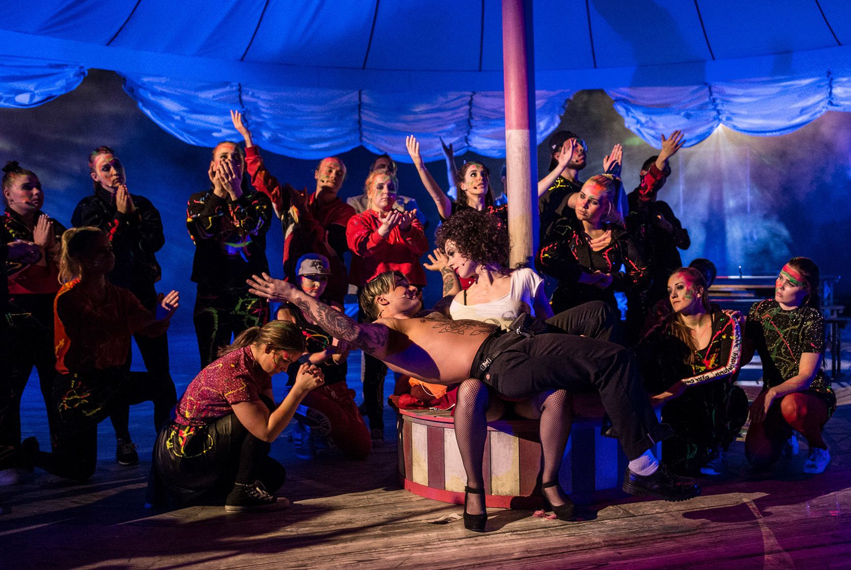 I Kasimir og Karoline blir vi med på ein vill oktoberfest der alle samfunnslag møtest for å drikke øl av gigantiske krus, ete digre pølser og gjere ting dei absolutt ikkje elles ville ha gjort. Alle har ein grunn for å gløyme kvardagen for ein kveld. Hovudscenen er gjort om til ei blanding av øltelt og sirkustelt, her er rutsjebanar og karusellar og karaokemusikken ligg som eit 4/4-dels bedøvande teppe på toppen av rusen. Her boltrar eit ungdommeleg, feststemt og talrikt ensemble seg i ein fargesterk og fantasirik scenografi.